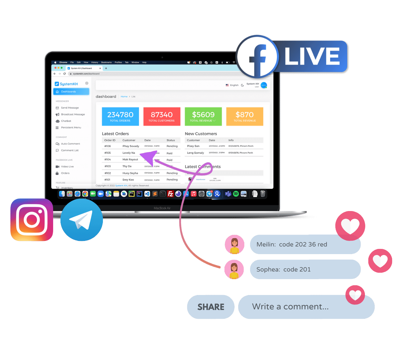 With SystemKH smart inventory, you could do more than just input or deduct product stock. Once the livestream begins, each comment order from Facebook Live will be recorded and automatically send out cart and payment link to customers, as well as automatically deduct product’s quantity from your inventory. Conveniencely,there’s every information you may need to know about the status of your business, from customers to revenue on the dashboard.